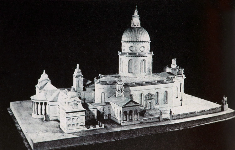 Makieta przedstawiająca pierwotny projekt katedry uwieńczonej strzelistą kopułą. W tym kształcie nigdy nie została zbudowana. Fotografia z książki "Parafie i kościoły Katowic"